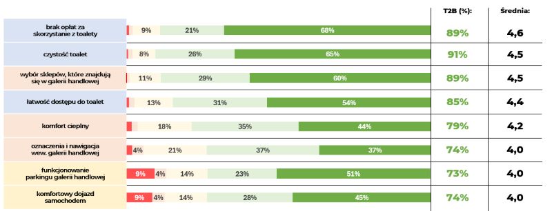 Badania Omnisense4 zrealizowanego na zlecenie Związku Polskich Pracodawców Handlu i Usług (ZPPHiU) i Polskiego Stowarzyszenia Najemców Powierzchni Handlowych (PSNPH)potwierdziły, że najważniejsze kwestie dla klientów odwiedzających centra handlowe to: czystość toalet (91% wskazań) i brak opłat za nie (89%), łatwość dostępu do toalet (85%), wybór sklepów w galerii handlowej (89%), komfort cieplny (79%), oznaczenia i nawigacja w obiekcie (74%), funkcjonowanie parkingu (73%) oraz łatwy dojazd samochodem (74%). Nieistotne natomiast są takie elementy, jak: rodzaj posadzek w sklepach, sposób pozyskiwania energii elektrycznej, widoczność instalacji podsufitowych czy rodzaj szkła w witrynach sklepowych.