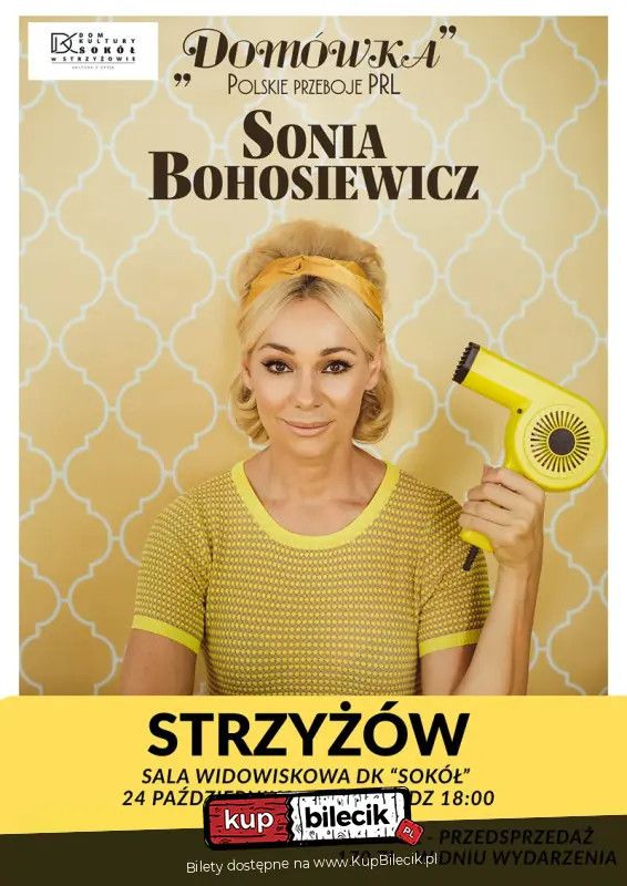bilety: Sonia Bohosiewicz zaprasza na spotkanie pełne zabawnych anegdot, wzruszeń i opowieści o pierwszych lekcjach życia. "Domówka" to lekka, a zarazem osobista podróż aktorki do czasów PRL-u oraz największych przebojów w historii polskiej piosenki. Spektakl Soni Bohosiewicz to komedia koncertowa - połączenie spektaklu, stand-upu, śpiewu i improwizacji. Aktorka podczas występu dzieli się z publicznością wyjątkowymi historiami o miłości, kobietach i mężczyznach.. Bilety do nabycia na: KupBilecik.plSonia Bohosiewicz - Domówka artyści: Sonia BohosiewiczSonia Bohosiewicz zaprasza na domówkę! "Domówka" to zabawna, pełna anegdot i wzruszeń osobista podróż Soni Bohosiewicz do czasów minionej epoki i największych przebojów w historii polskiej piosenki. W repertuarze takie przeboje, jak "W moim magicznym domku", "Małgośka", "Jesteś lekiem na całe zło" czy "Józek, nie daruję ci tej nocy". Bilety do nabycia na: KupBilecik.pl |